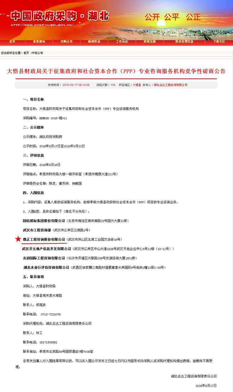 【經營成果】我司入圍大悟縣財政局關于征集政府和社會資本合作(PPP)專業咨詢服務機構